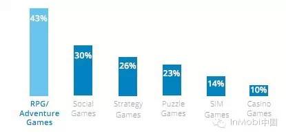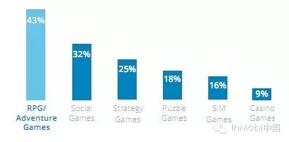 中国玩家,RPG/冒险游戏比例为43%,社交游戏为30%,策略游戏为26%,益智游戏比例为14%,模拟经营类游戏为14%,博彩游戏为10%。