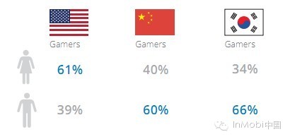 美国的年轻玩家(15-18岁)和老年玩家(45+)都比中韩两国要多。这是由于智能手机在这三个国家的渗透率造成的。在中国,智能手机主要流行与16-34岁的用户群体,然而美国用户,年龄在45-54岁该阶段,占据智能手机使用率较大比例,该年龄阶段的用户拥有更多休闲游戏时间,手游代替了传统的填字游戏和玩桥牌时间。