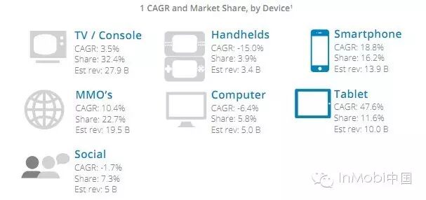其中智能手机游戏CAGR为18.8%,市场份额占比为16.2%。平板游戏CAGR为47.6%,市场份额占比为11.6%。移动游戏市场将在掌机和PC游戏的流行趋势消退下,占总市场的28%。