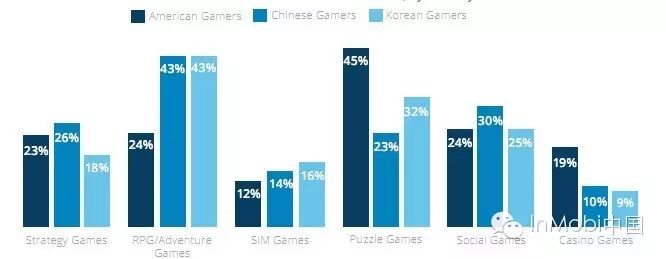 韩国玩家,RPG/冒险游戏为43%,社交游戏为32%,策略游戏为25%,益智游戏比例为18%,模拟经营类游戏为16%,博彩游戏为9%。