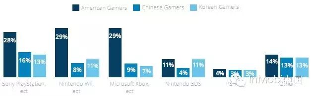 在本次接受调查的1292位移动玩家中,也统计了电子游戏机的选择比例。而美国的主机游戏(除去PC游戏)比例明显高于中韩两国。