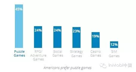 美国更亲睐益智解谜游戏,益智游戏比例为45%,RPG/冒险游戏为24%,社交游戏为24%,策略游戏为23%,博彩游戏为19%,模拟经营类游戏为12%。