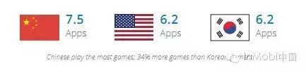 中国玩家游戏平均下载数为7.5款,为美韩两国下载量的20%以上。